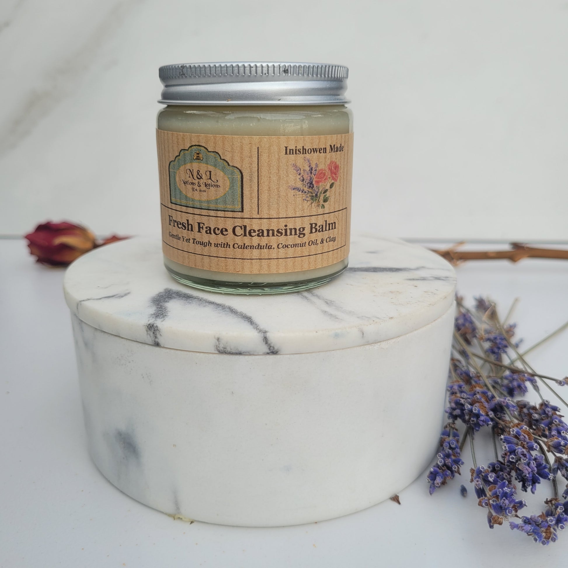Transform your skincare routine with our Fresh Face Cleansing Balm! Made with natural oils, butters, and clay, this balm gently and effectively removes make-up, dirt, and impurities from your face. As you mix it with water, it transforms into a creamy lather that rinses off easily without the need for soap. Experience the power of plant-based cleansing for radiant, clean skin.